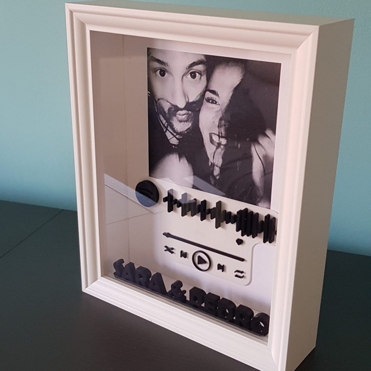 Foto impresa, código de Spotify y nombre o frase a elegir. Escanea en tu móvil el código y comenzará a sonar la canción que elegiste 🙂